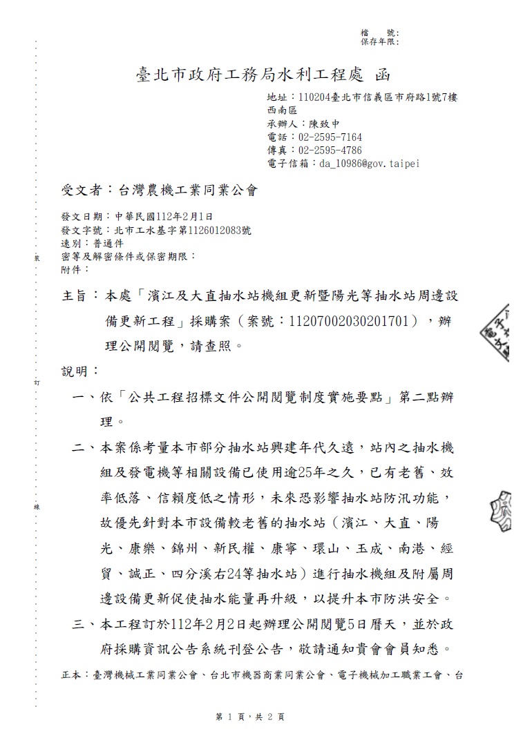 1120201(電子公文)_臺北市政府工務局水利工程處_「濱江及大直抽水站機組更新暨陽光等抽水站周邊設備更新工程」採購案.pdf