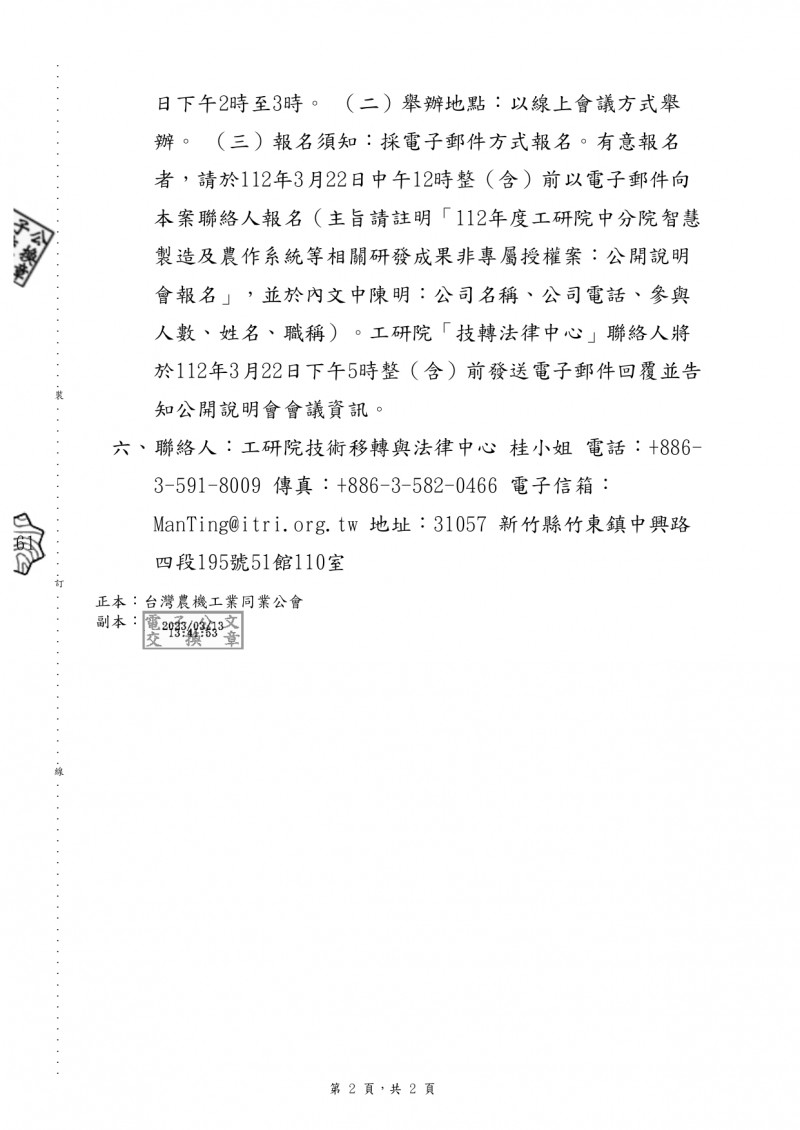 「112年度工研院中分院智慧製造及農作系統等相關研發成果非專屬授權案」公開說明會,轉知會員等相關廠商把握機會參與本次推廣活動,請查照。
